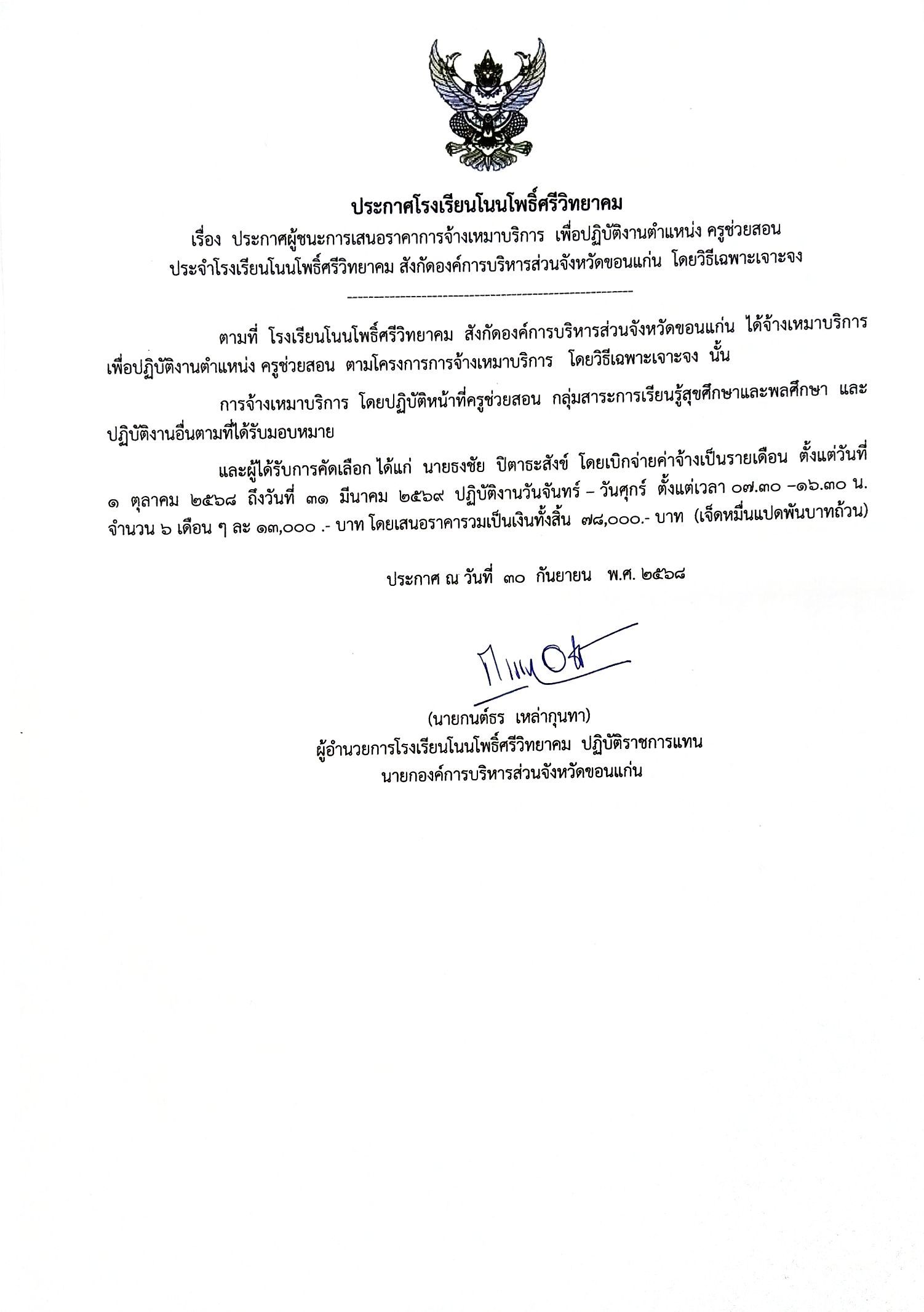 ประกาศผู้ชนะการเสนอราคาการจ้างเหมาบริการ เพื่อปฏิบัติงานตำแหน่ง ครูช่วยสอน ประจำโรงเรียนโนนโพธิ์ศรีวิทยาคม สังกัดองค์การบริหารส่วนจังหวัดขอนแก่น