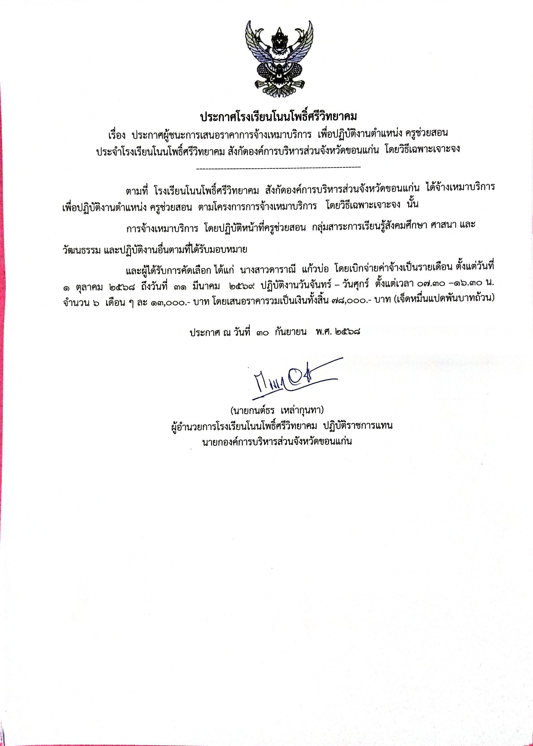 ประกาศผู้ชนะการเสนอราคาการจ้างเหมาบริการ เพื่อปฏิบัติงานตำแหน่ง ครูช่วยสอน ประจำโรงเรียนโนนโพธิ์ศรีวิทยาคม สังกัดองค์การบริหารส่วนจังหวัดขอนแก่น
