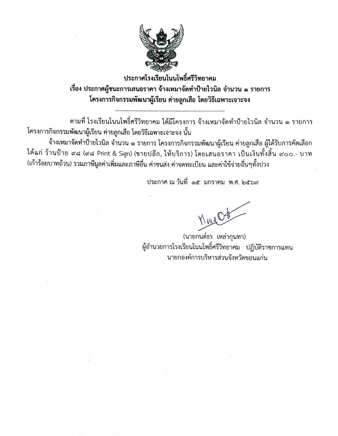 ประกาศผู้ชนะการเสนอราคา จ้างเหมาจัดทำป้ายไวนิล จำนวน ๑ รายการ โครงการกิจกรรมพัฒนาผู้เรียน ค่ายลูกเสือ