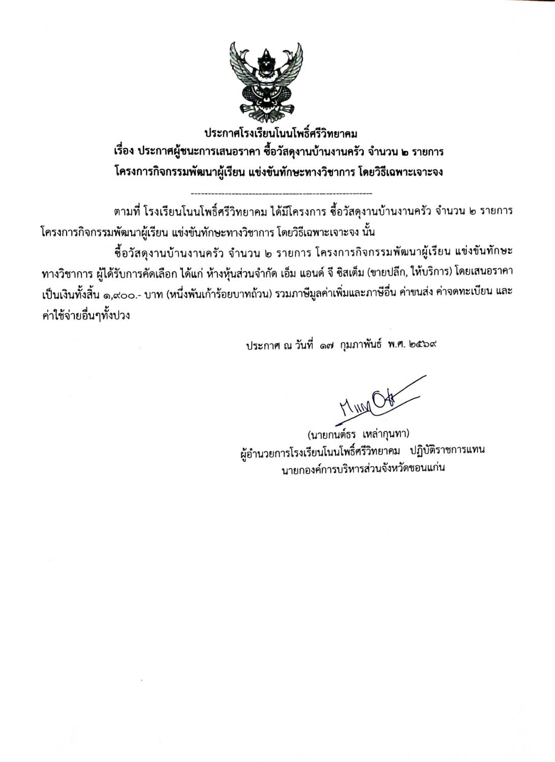 ประกาศผู้ชนะการเสนอราคา ซื้อวัสดุงานบ้านงานครัว จำนวน ๒ รายการ โครงการกิจกรรมพัฒนาผู้เรียน แข่งขันทักษะทางวิชาการ