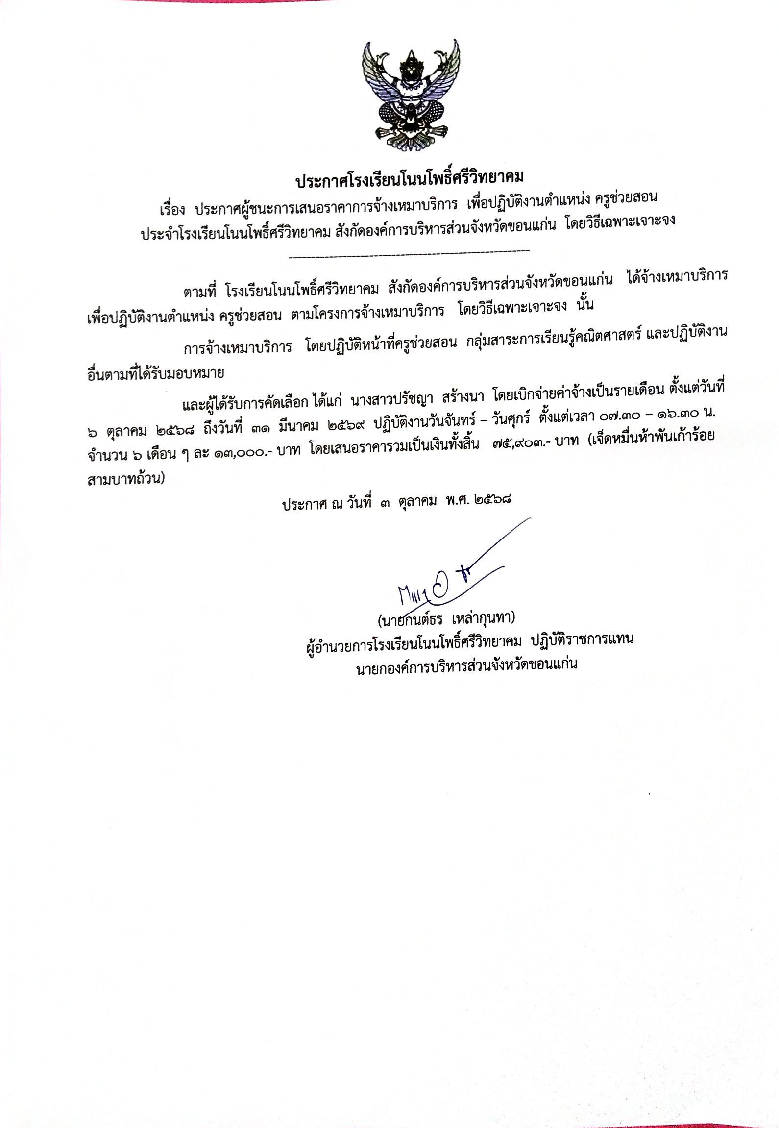 ประกาศผู้ชนะการเสนอราคาการจ้างเหมาบริการ เพื่อปฏิบัติงานตำแหน่ง ครูช่วยสอน ประจำโรงเรียนโนนโพธิ์ศรีวิทยาคม สังกัดองค์การบริหารส่วนจังหวัดขอนแก่น