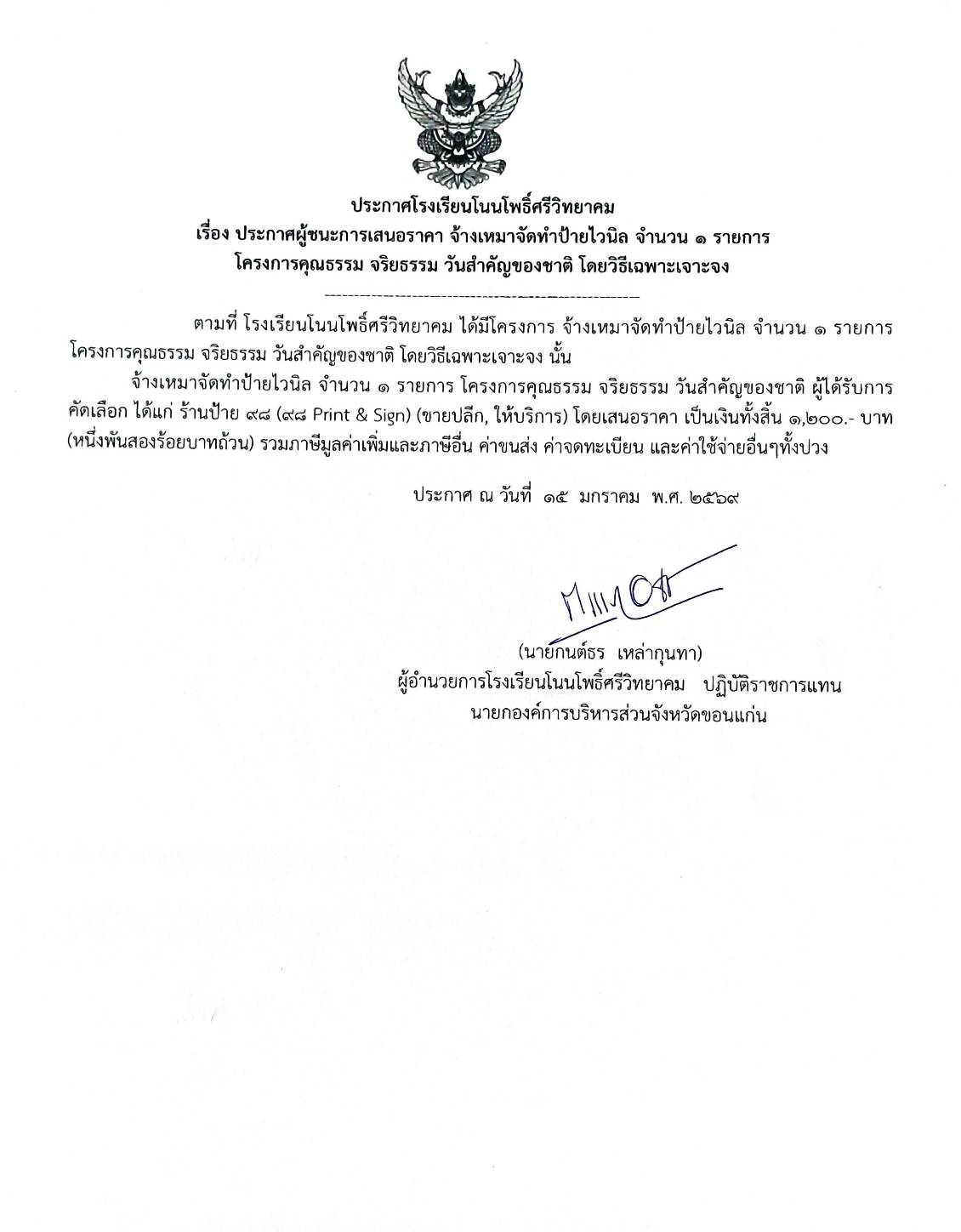 ประกาศผู้ชนะการเสนอราคา จ้างเหมาจัดทำป้ายไวนิล จำนวน ๑ รายการ โครงการคุณธรรม จริยธรรม วันสำคัญของชาติ
