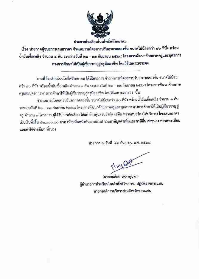 ประกาศผู้ชนะการเสนอราคา จ้างเหมารถโดยสารปรับอากาศสองชั้น ขนาดไม่น้อยกว่า ๔๐ ที่นั่ง พร้อมน้ำมันเชื้อเพลิง จำนวน ๑ คัน ระหว่างวันที่ ๒๑ – ๒๓ กันยายน ๒๕๖๘ โครงการพัฒนาศักยภาพครูและบุคลากรทางการศึกษาให้เป็นผู้เชี่ยวชาญสู่ครูมืออาชีพ