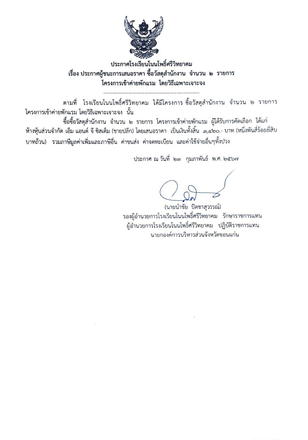 ประกาศผู้ชนะการเสนอราคา ซื้อวัสดุสำนักงาน จำนวน ๒ รายการ โครงการเข้าค่ายพักแรม