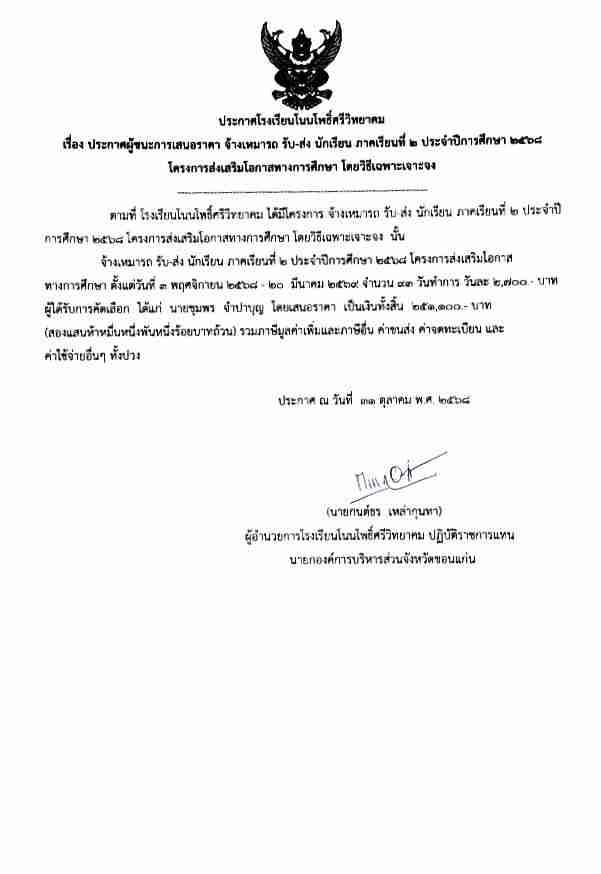 ประกาศผู้ชนะการเสนอราคา จ้างเหมารถ รับ-ส่ง นักเรียน ภาคเรียนที่ ๒ ประจำปีการศึกษา ๒๕๖๘ โครงการส่งเสริมโอกาสทางการศึกษา