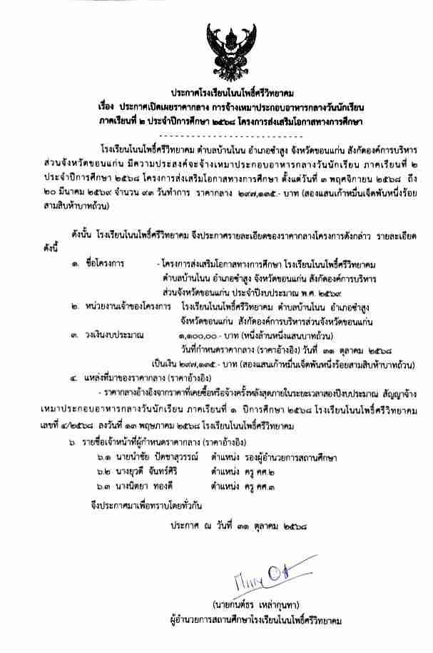 ประกาศเปิดเผยราคากลาง การจ้างเหมาประกอบอาหารกลางวันนักเรียน ภาคเรียนที่ ๒ ประจำปีการศึกษา ๒๕๖๘ โครงการส่งเสริมโอกาสทางการศึกษา